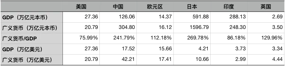 从绝对规模上来看,中国广义货币比美国、欧元区及英国之和还要大,也超过美国、日本、英国、印度四国广义货币之和。从增速上来看,中国M2在大部分时间都比美国M2快。从与GDP的相对规模上来看,中国M2更是大幅高于美国M2。