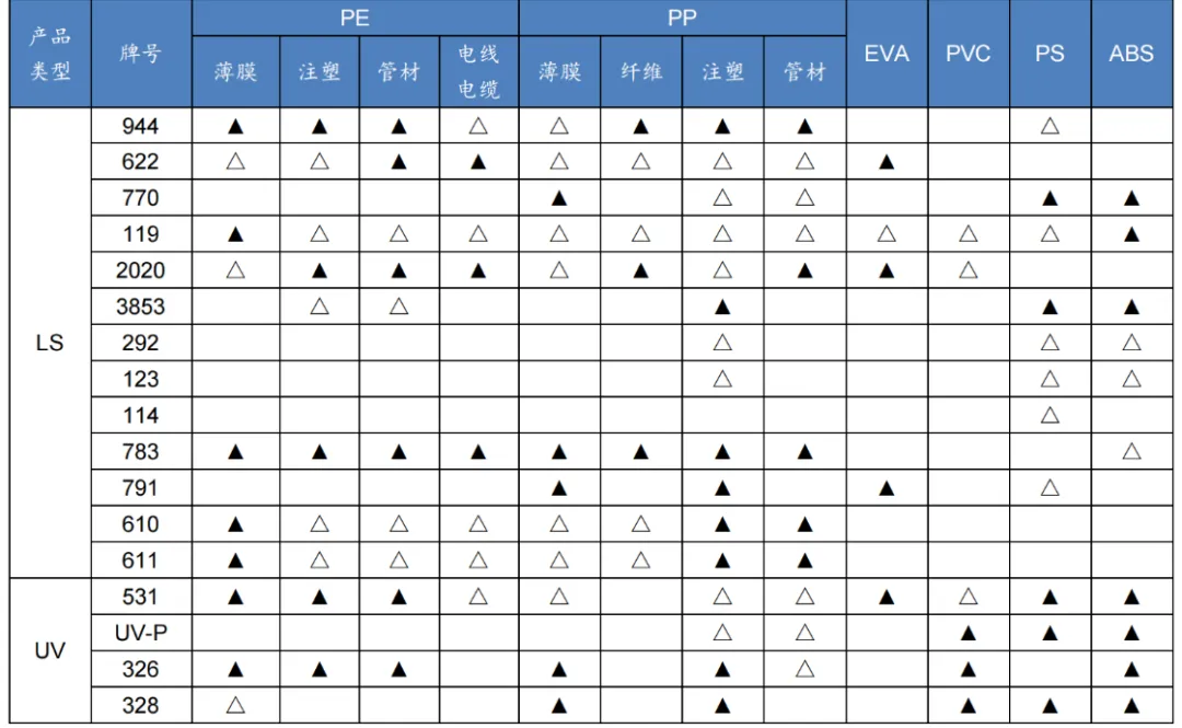 来源:公司公告,资料整理  注:▲推荐使用;△可以使用。LS:受阻胺类光稳定剂;UV:紫外线吸收剂;