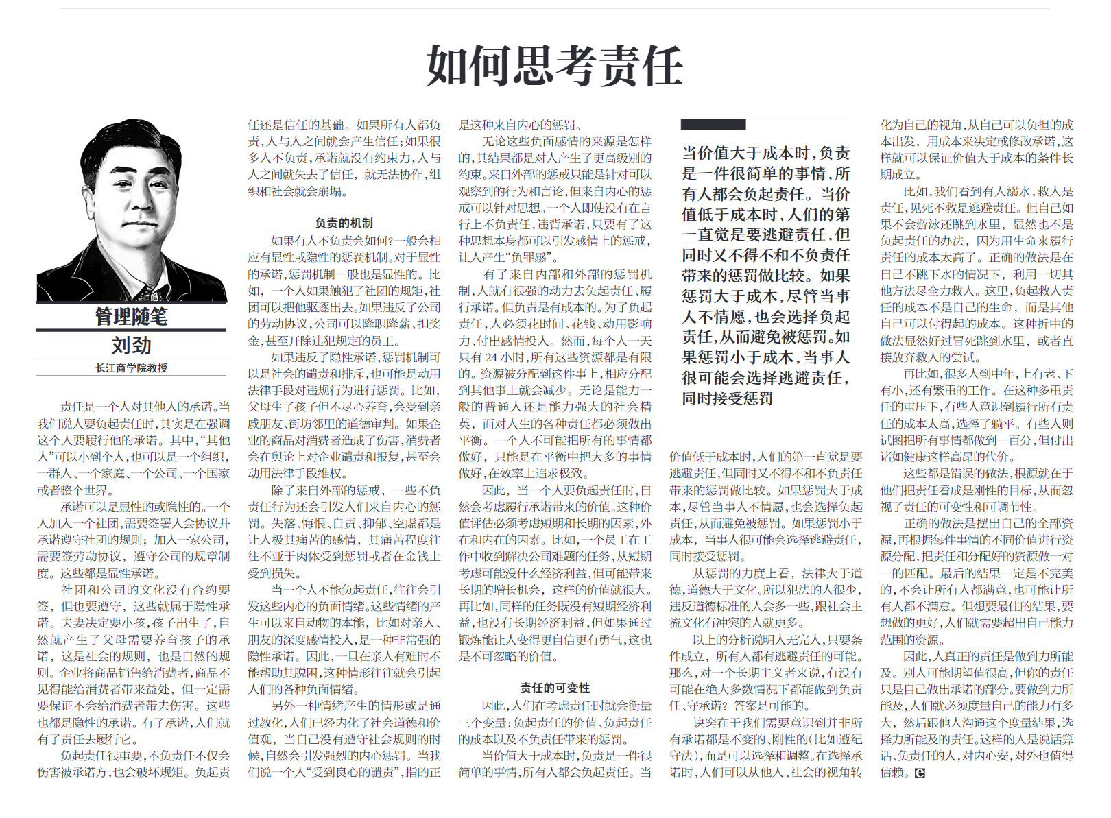因此,人们在考虑责任时就会衡量三个变量:负起责任的价值、负起责任的成本以及不负责任带来的惩罚。