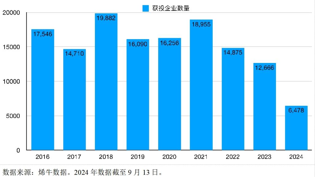 通过观察2016年至2024年中国获得风险投资的企业数量会发现,2018年出现了高峰,2021年也出现过,但2022年后获投企业数量开始持续减少,2023年有12666家企业获得投资,相比2018年下降了36%。