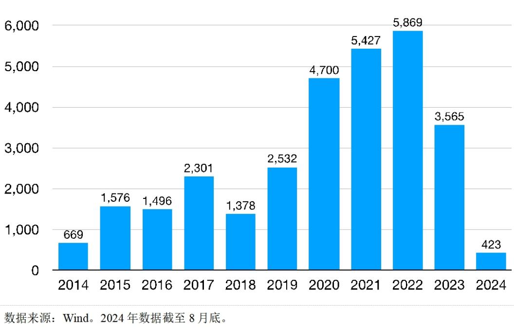 通过观察2014年至2024年8月底A股IPO融资金额,我们会发现,疫情三年其实是A股IPO融资最多的三年。但到了2023年,融资额同比下降近40%至3565亿元。2024年前8个月的融资额更是只有423亿元,还不到2023年的零头。