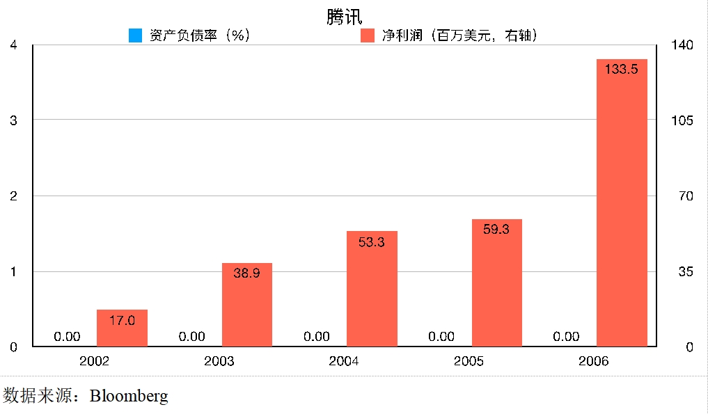 2000年4月,香港盈科和IDG共投资腾讯220万美元。2004年6月16日,腾讯上市,实现融资15.54亿港元。2002年至2006年,腾讯一直没有举债。与谷歌类似,强劲的盈利能力使得腾讯能够一直保持低负债,甚至是零负债。