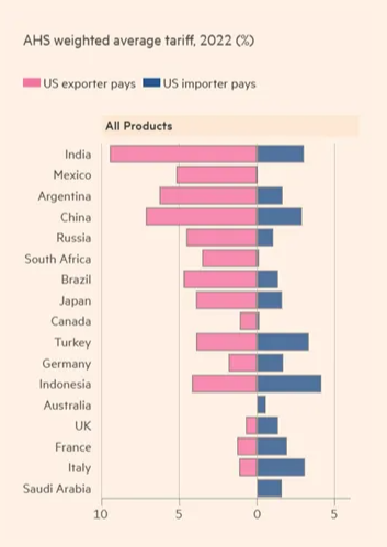 注:来自《金融时报》,对比各国与美国关税。其中印度与美国关税差异最为显著,而2022年中国对美国产品平均关税为7%,美国对中国产品平均关税是3% 。不过2022年后相关数据更为复杂,这些仅作参考。