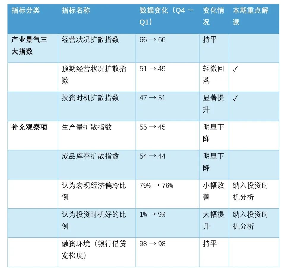 2025年第一季度的BSI调研,呈现出一个清晰而复杂的信号组合:整体经营状况维持稳定,未来预期略有调整,但投资信心出现了多年未见的显著改善。谨慎仍是企业普遍的底色,但在局部领域,已有新的动能在微光中萌芽。