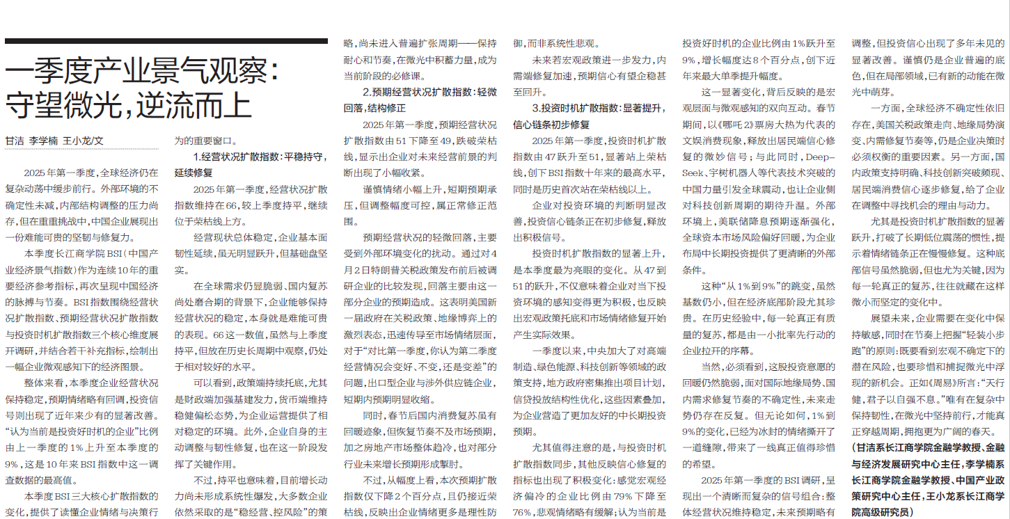 近日发布的2025年第一季度长江商学院BSI(Business Sentiment Index,中国产业经济景气指数,简称BSI)指数报告作为连续10年的重要经济参考指标,再次为我们呈现中国经济的脉搏与节奏。BSI指数围绕经营状况扩散指数、预期经营状况扩散指数与投资时机扩散指数三个核心维度展开调研,并结合若干补充指标,绘制出一幅企业微观感知下的经济图景。
