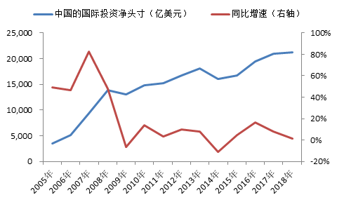 如图表 2所示,作为一个发展中国家,中国并非资金输入国,而是资金输出国,只不过中国输出资金不是以民间企业或私人方式对外输出,而是以央行外汇储备对外投资的形式实现的。换句话说,无论是通过经常账户,还是FDI,进入中国的外汇,都最终在央行被兑换为了人民币。这些外汇成为了央行的外汇储备(后来少部分转移给了中投),然后进行对外投资(图表3)。由于中国有大量外汇进行对外投资,所以中国的国际投资净头寸(对外所有资产-对外所有负债,正数为债权国,负数为债务国)在2018年年末时已超过2.1万亿美元(图表4)。
