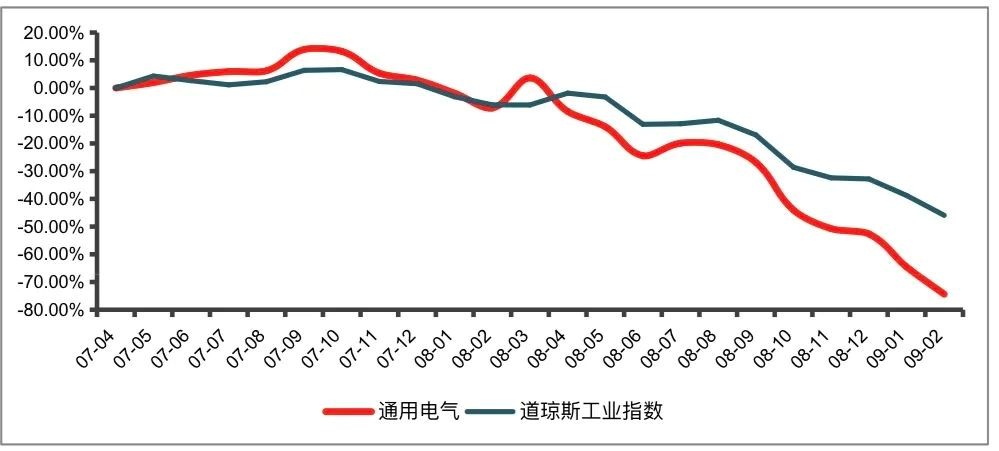 2007-2008年金融危机的爆发,使得美国多家银行与非银行金融机构濒临破产,GE也难以独善其身。年报显示,GE金融净利润从07年的100亿美元缩水至08年的70亿美元,下跌近30%。GE金融之前采用的高杠杆被当时较高的业绩所支撑,然而金融危机爆发后,金融业务利润下降,GE一时陷入了经营紧张状态,引发市场恐慌与股价暴跌,资本运作陷入困境。GE集团股价从次贷危机前40美元跌至20美元以下,2009年3月更是一度跌至6美元,市值比次贷危机前缩水80%。尤其从2008年4月开始,GE股价呈持续下跌状态。金融的“内在不稳定性”放大了市场波动对GE集团整体的股价影响。