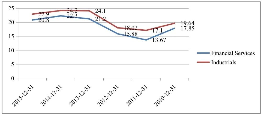 图表7:美国资本市场工业股和金融股的席勒PE