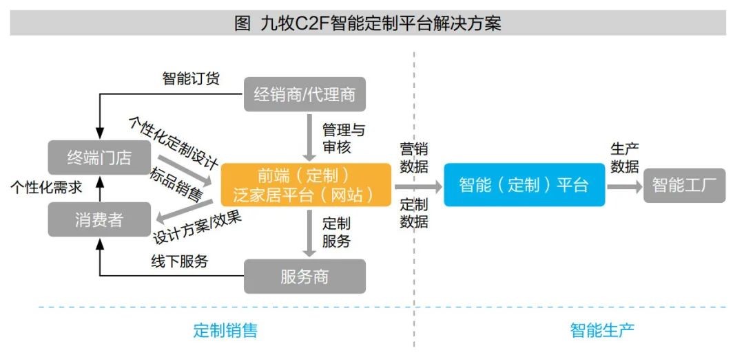 “泛家居平台”作为整个智能定制解决方案的核心大脑,连通线上网店、线下门店、经销商、服务商和工厂。首先,该平台从终端门店收集消费者的标品购买或个性化定制需求,以及经销商和代理商的批量订货需求;随后将需求传递给后端生产平台,将定制需求的设计方案和效果图反馈给消费者确认,确认后再将定制数据传给后端生产平台;接着,后端生产平台经过整合分类下单给工厂指导生产。待生产完成后,再由泛家居平台将成品交由对应的服务商,为客户提供一站式配送安装和统一售后等服务。