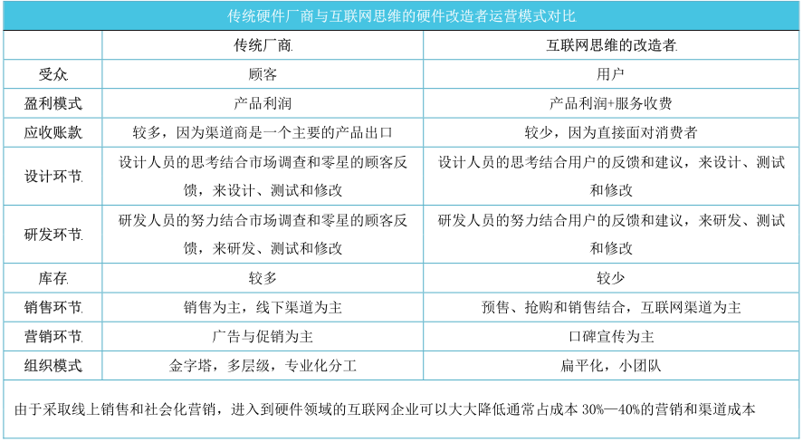 图表3: 传统硬件厂商与互联网思维的改造者运营模式对比