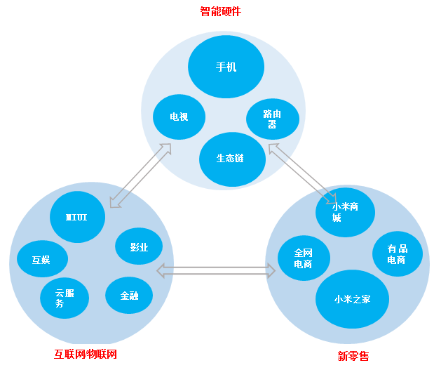 截至2014年,真正将“软件+硬件+互联网服务”融合好的也仅有苹果。小米力图学习苹果,将小米的商业模式简化为“软件+硬件+互联网服务”铁人三项。即从应用软件到系统层面再到最后的硬件,试图在一个大的安卓生态系统中构建一个由小米手机、MIUI、小米盒子、商城、云服务和开发者组成的生态圈。