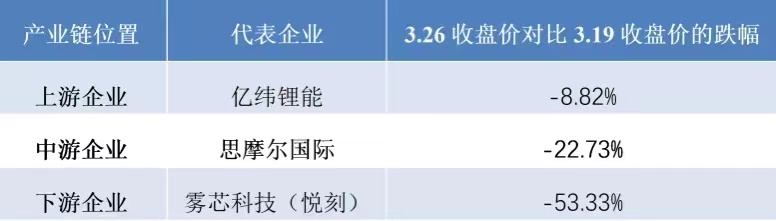 图表1:2021年3月19日-3月26日电子烟产业链代表性企业股价跌幅