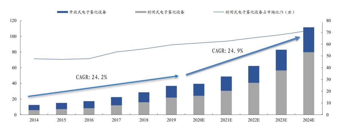 注2:目前中国市场上以封闭式电子烟为主要产品,开放式电子烟市场规模较小。