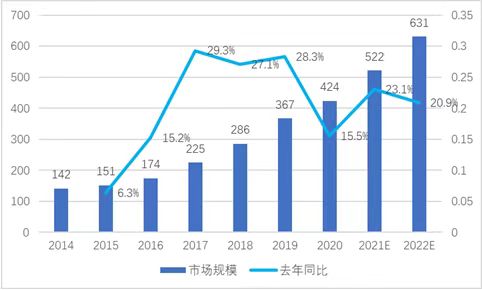 图表8:2014-2022年全球电子烟行业市场规模及预测(亿美元)