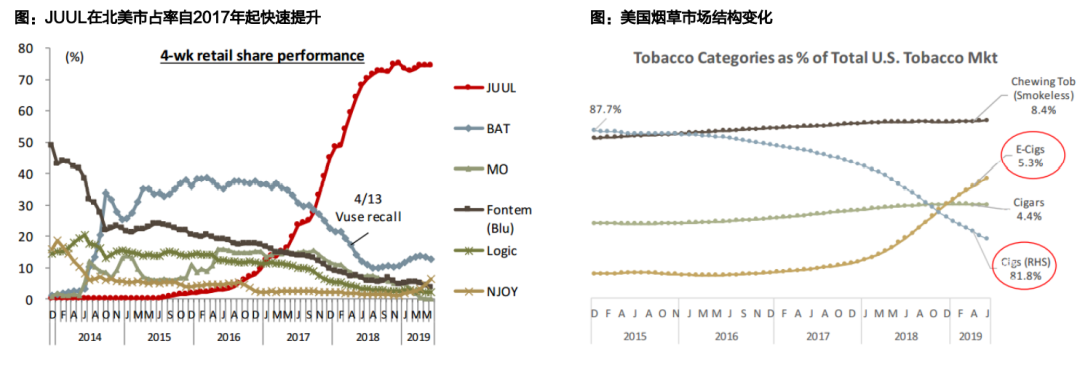 直到2016年,美国Juul公司发明了新技术,其令电子烟口感与香烟接近,同时令电子雾化设备的便携性获得提升,在北美推出后大获成功,封闭式小烟(即当前常见的电子烟)市场正式兴起。Juul的市占率快速提升,2018年市占率已超70%。而全行业也因这一发明而迅速兴起,2017年起美国电子烟渗透率开始加速提升,2019年已提升至5.3%。