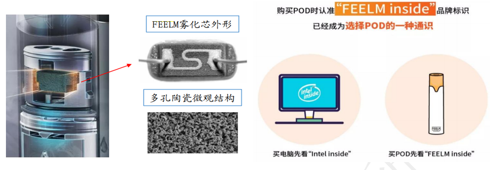 2016年,中国企业麦克韦尔(即思摩尔国际)改良了陶瓷雾化芯技术,推出“黑陶覆膜雾化芯”,各方面性能全面超越棉芯,并获得各大电子烟制造企业的认可。凭借这一专利技术,思摩尔国际掌握了全球电子烟产业链中不可或缺的核心产品,甚至与电脑CPU领域“Intel Inside”一样,全行业逐步形成了“FEELM inside”的品牌认知。2019年思摩尔国际含有陶瓷加热技术的电子雾化设备收入呈爆发式增长,达到35.9亿元,同比增长765.9%。