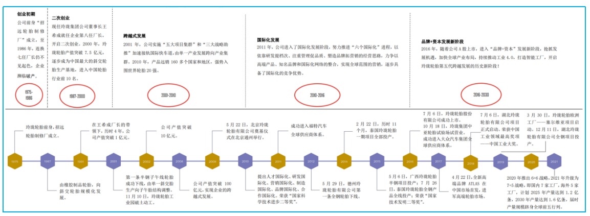 伴随时代的发展,玲珑轮胎也开始了四十余年的成长历史。从1975年的招远轮胎制修厂,到2016年7月在沪市主板上市,经过多次股权变更和改制,玲珑轮胎目前已成长为国内产销量最大、营收最好的轮胎专业生产企业之一。根据英国权威轮胎媒体Tyrepress发布的2021年全球轮胎最新排名,玲珑轮胎冲入世界轮胎12强。2020年玲珑半钢胎产量、子午胎产量、海外工厂产量及利润均居中国同行业第一。