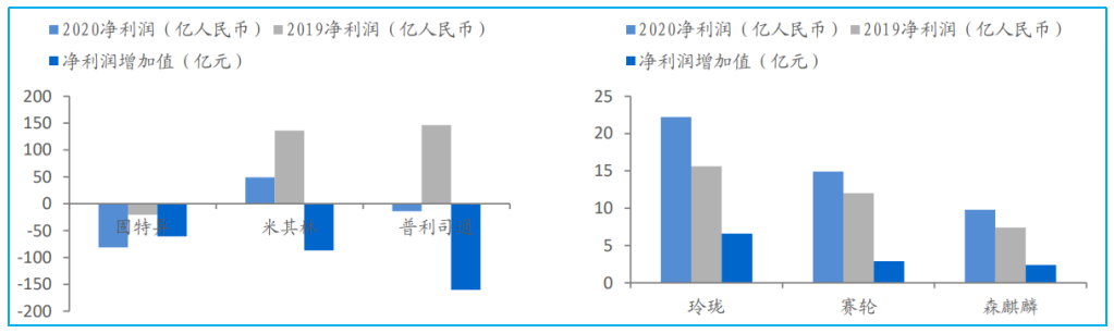 图表3:世界部分主要轮胎企业2020年毛利率、净利润(亿元)变化对比
