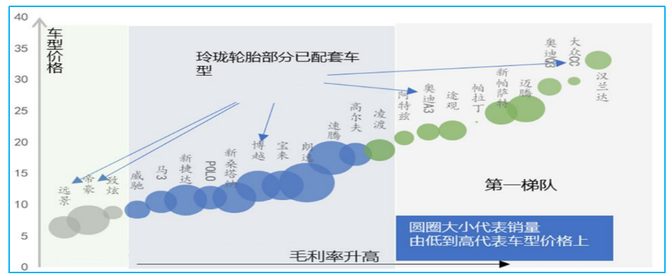 路径差异在于,10年前,中国整车厂多以合资厂为主,中国轮胎企业凭借价格优势和品质进步,艰难地在配套市场中逐步争取份额,这10年,在国产汽车品牌的崛起中迎头赶上,逐渐在全球范围内站稳脚跟——玲珑轮胎已经击穿“配套整车的价格带”,配套整车价格带从10万左右向20万及以上迈进,玲珑轮胎的已配套车型价格带,甚至延伸到数百万售价的车型。
