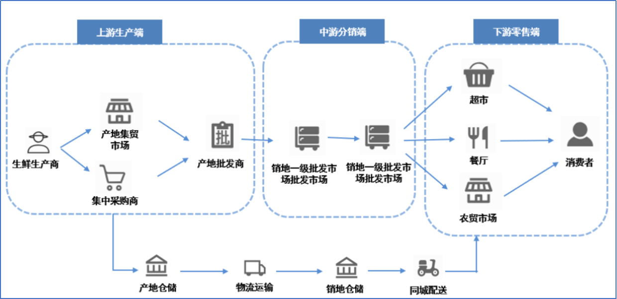 由于生产端的分散,地域的广袤,原产地的采购一般由“产地”的采购商进行(中间也许还存在不出资收购单纯做中介的“菜行”、“蔬菜经纪人”等角色),采购商收购完成后,在当地的批发市场出售给“产地”批发商,随后通过物流运至“销地”的一级农产品批发市场(往往跨几个省市),再进入“销地”的二级批发市场(往往专注一个省市),随后进入超市、餐厅、社区农贸市场这一类终端零售商,最终销售给消费者。