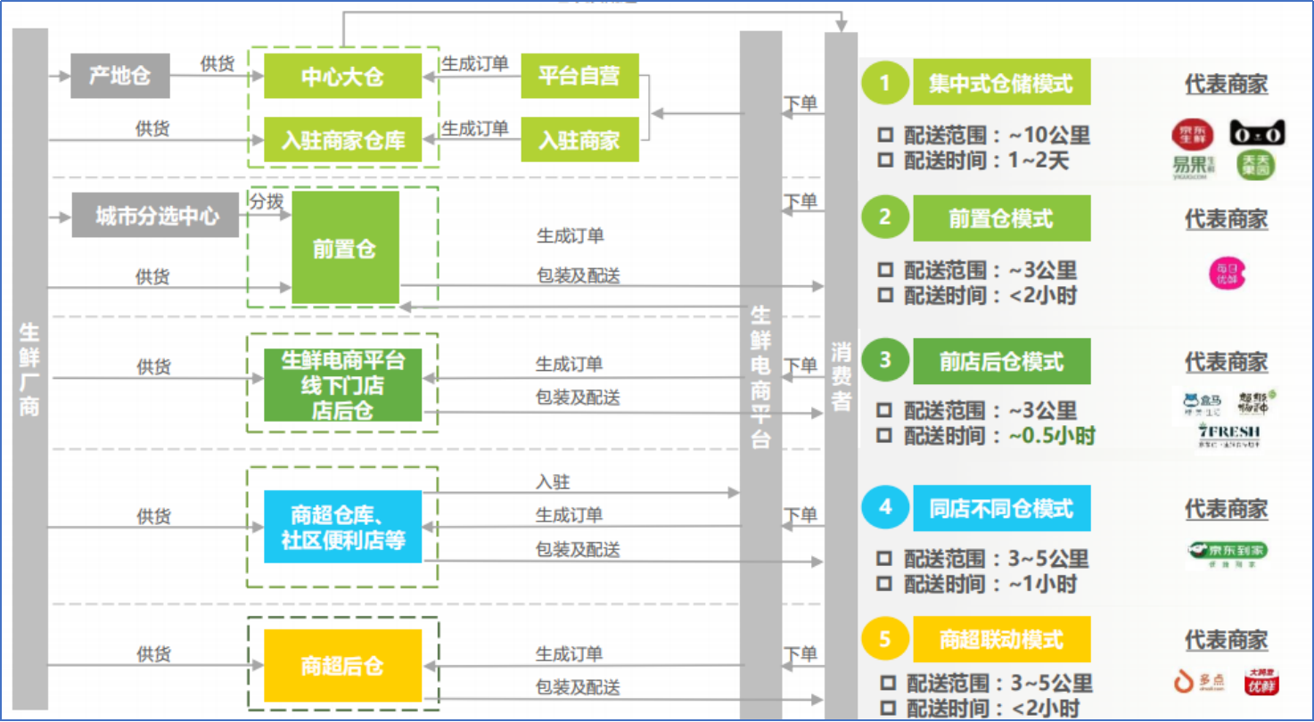 其中,生鲜电商近几年异军突起,各互联网巨头均有涉足,因为距离消费互联网较近,消费者较为熟悉,其近年来模式不断迭代,包括垂直电商平台模式、社区生鲜店模式、到家+到店模式、前置仓模式、社区团购模式等。