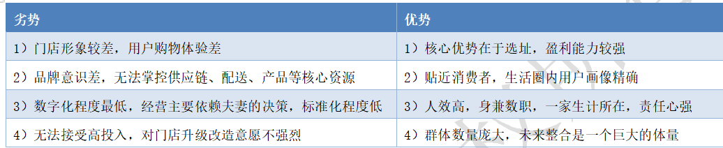 但仔细观察以往夫妻店的主要销售品类,就会发现,烟酒、饮料、零食、日杂百货是主流。在这些品类上,互联网企业没有优势,或者说没有更大的改进空间。夫妻店已经习惯于被各类供应商的“渠道小哥”围绕,一个电话就能送货上门,隔三差五嘘寒问暖,享有可商量的较长账期。两相对比,互联网模式的“撬棍”缺少“支点”。所以阿里后续也同时并行盒马鲜生,京东同时并行7fresh,阿里收购高鑫零售(大润发),苏宁收购家乐福,腾讯和京东投资永辉超市,这都是在战略上围绕大零售体系的种种尝试。
