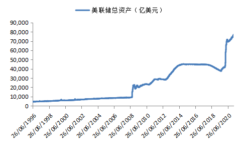 从图表 1可以看出,联邦基金利率目前处于近乎0的水平上。实际上,在2008年美国金融危机发生后的很长一段时间内,联邦基金利率就停留在近乎0的水平上了。中间只是因为经济复苏短暂的加过几次息,但随着经济趋冷和新冠疫情的扩大,美联储很快再次将联邦基金利率压了下来。对美联储来说,0利率意味着传统的货币政策已基本用尽,但经济乏力迫使美联储开发了一系列的新工具,其中最重要的就是量化宽松。量化宽松就是美联储创造大量基础货币直接去市场中购买各类资产以压低这些资产的收益率,进而降低经济中的融资成本,推动经济复苏,其带来的直接后果就是美联储资产负债表的扩大。图表 2就是美联储的总资产数量,在2008年初的时候这个指标还不到9000亿美元,最新的数字已接近7.7万亿美元了,尤其是2019年开始,其几乎是直线上升。