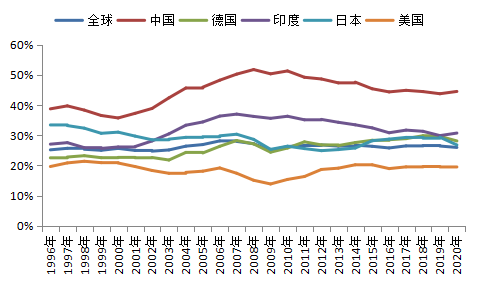 的确,中国的储蓄率很高,图表 1是世界部分经济体总储蓄占GDP的比例。