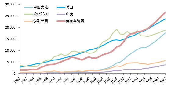 图表2:1980年以来儒家经济圈及世界主要经济体GDP总量(十亿美元)