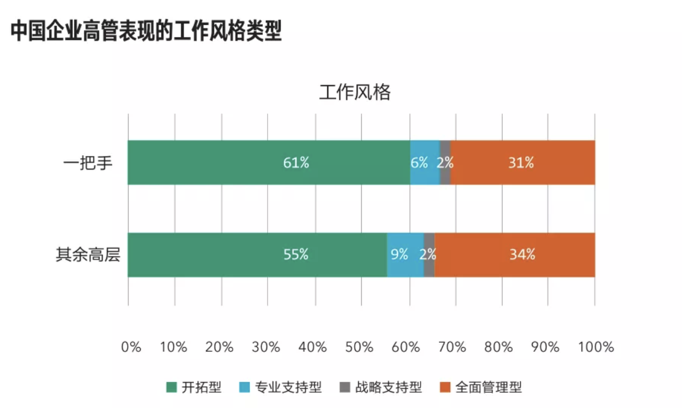以长江商学院企业家学员为样本的统计显示,其中权威型自然人格超过半壁江山(52%),其余各型近乎平均地分配了剩下的份额:社交型10%、耐心型6%、逻辑型12%和随机应变型21%。其中随机应变型视具体的情境,可转化为其余四型。由此一来,权威型的管理风格占到整体数据的60%,并且不分行业(统计中包含八个主要行业:教育培训咨询、房地产家居、制造、金融、零售、计算机互联网、医疗保健、电力)、地域,均以权威型管理者为主。而这种权威型的管理风格又与管理者的层级呈正相关,即职位越高,权威型管理者比例越高。其中尤为突出的是,正职又高于副职,尤其是企业一把手,大多数(60%)是权威型,而除一把手外的其余高管,权威型则不到半数(48%)。实际表现的管理风格维度,一把手的开拓型比其余高管高出5个百分点,而全面管理型却要低3个百分点。(参见图表:“中国企业高管表现的工作风格类型”)