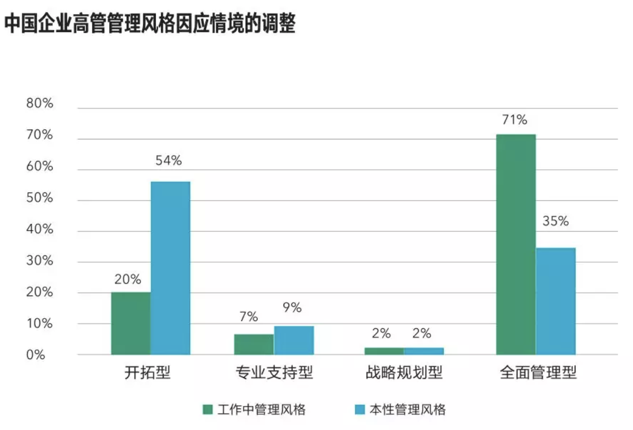 这个结果亦得到细分数据的支持。各行业企业高管弱化权威型领导力行为的比例,均超过强化者,尤其以制造业逆转幅度最高,达72%。而企业一把手权威型逆转高达71%。企业高管的本性管理风格以开拓型为主(54%),全面管理型为辅(35%)。但实际展现的管理风格,前者降至20%,后者则增至71%。(参见图表“中国企业高管管理风格因应情境的调整”)