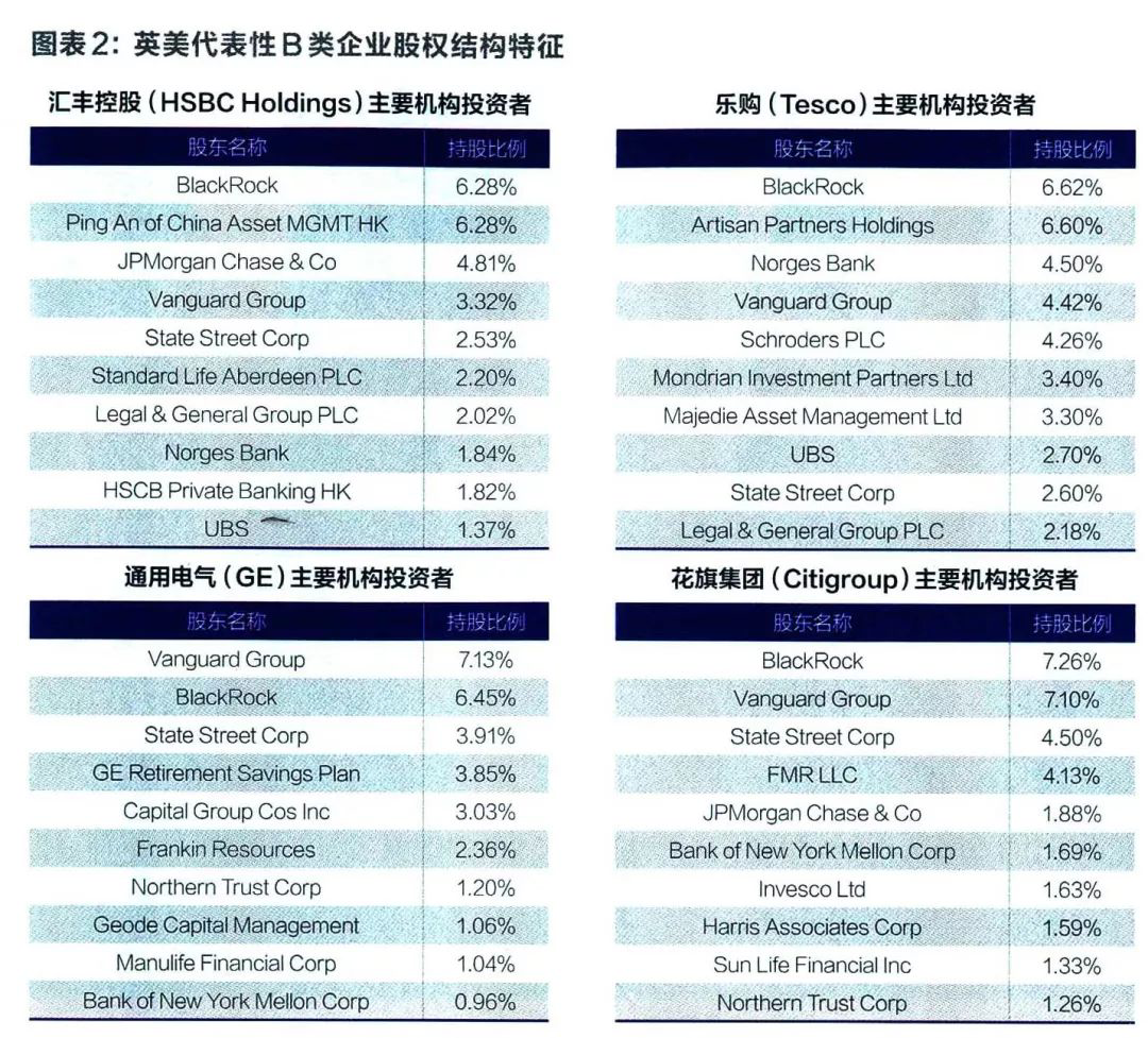 现代企业制度下的B类企业的主要特征是:其一,股权分散,前十大股东主要是机构投资者,单一股东持股比例相对比较低。由此,B类企业一般不会受到任何家族或者自然人控制,也不是国家或者政府主导。其二,B类企业一般为整体上市,而A类家族企业少有整体上市。其三,B类企业的管理权和所有权分离程度比较高,核心管理层在其所管理的企业中持股比例小。其四,B类企业对外部环境的要求比较高,如完善的法制与独立的司法,公平公正透明的社会,相对成熟的公司治理体系等,都是B类企业生存的必要条件。基于相对完善的制度安排和保障,B类企业相对更加开放与包容,在整合外部资源及全球优秀人才方面拥有独特的优势。