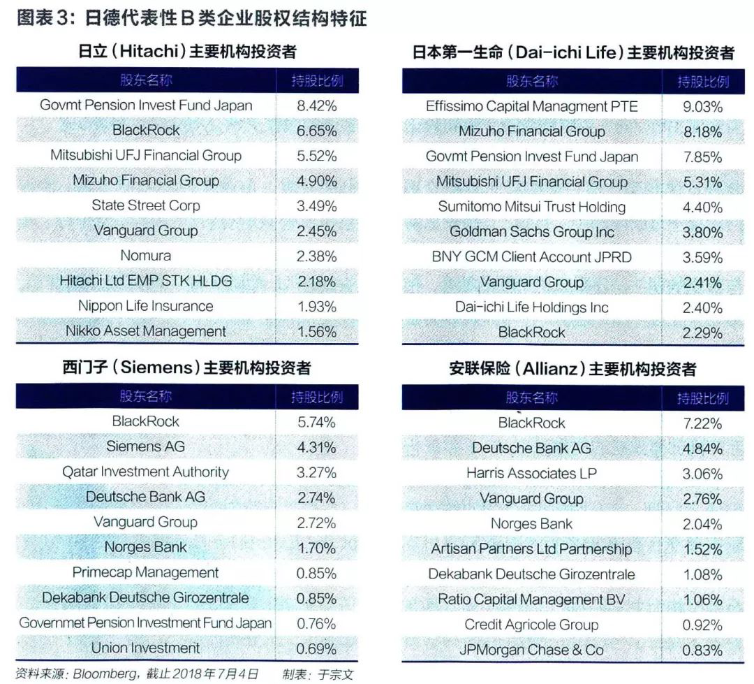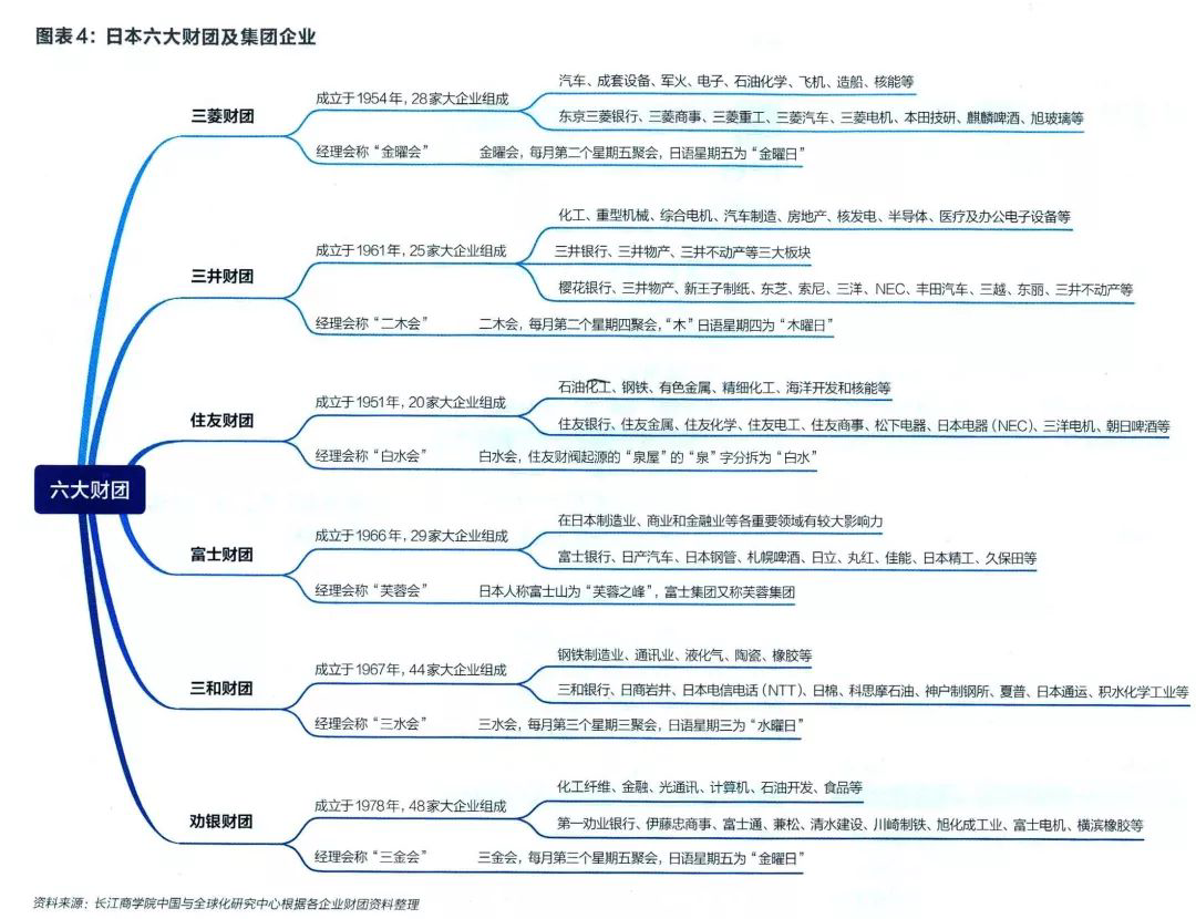 B类企业可以再细分为英美型和日德型两大类型。美国和英国企业的主要股东主要来自机构投资者(图表3),日本和德国企业的主要股东以银行及其他非金融机构为主(图表4)。其中,日本是东亚唯一诞生了一批B类企业的经济体。日本企业股权关系银行化更为突出(主力银行制),主要由几家大型财团掌控,企业间的股权关系交织交错(图表5)。
