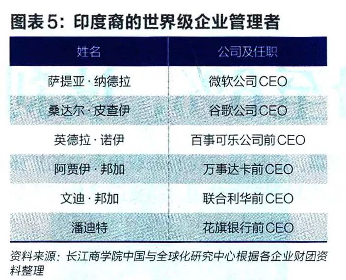 当前,中国企业参与全球化竞争的最大短板之一,是缺乏一批具有突出全球资源整合能力和价值对接能力的B类企业。面向未来,在全球大变革的时代,B类企业赖以维系的改革开放、规范透明、公平公正的管理体系和制度安排,具有广泛的全球价值对接能力,这对于提升其全球资源整合能力,特别是吸引全球高端人才,是非常独特的制度优势。例如,近年来欧美企业出现了一批出色的印度裔管理者(图表5)。印度裔管理人才的异军突起充分反衬出B类企业在整合全球人才为我所用方面的制度优势。