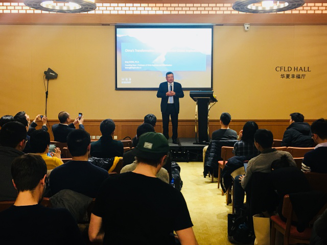 2018年1月8日,中国 北京 “随着中国一步步地走进世界舞台的中心,中国可能需要思考:中国的再次崛起,将给世界发展带来怎样的新理念、新模式、新价值和新贡献?”长江商学院院长、中国商业与全球化教授项兵博士做客清华大学苏世民书院(Schwarzman College),在“中国的变革及其全球影响”(China’s Transformation and Its Potential Global Implications)的主题演讲中开篇问“道”。项院长指出,我们是处于一个多种重大变革聚焦的时代,不仅仅是中国,全世界都可能要反思和变革旧的发展思维和模式,以全新发展之“道”构建人类发展命运共同体。“我个人比较推崇中国先哲的两个发展理念:和而不同和天人合一。”项院长谈到,“可能对世界发展产生重要的思想影响。”
