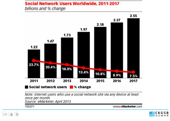 在社交时代,现在已经有17亿用户,再过两三年,可能会超过24、25亿,将来1/3的人口都是社交媒体的人口,包括facebook、人人、微信。