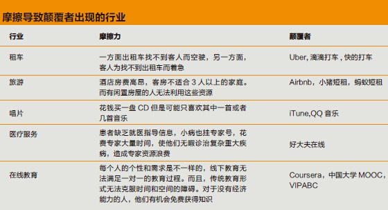 所谓摩擦是指消费者做任何一件事情的中间环节存在阻力。此时,颠覆性创新将逆势而上。在克服这种摩擦力的过程中,新的商业模式会诞生,比如打车软件。在北京,外出打车简直是一件碰大运的事情,国内其他一线城市也普遍存在这样的问题。这意味着需求没有被充分解决,行业的服务链条上存在摩擦,导致打车软件这种新势力的出现。