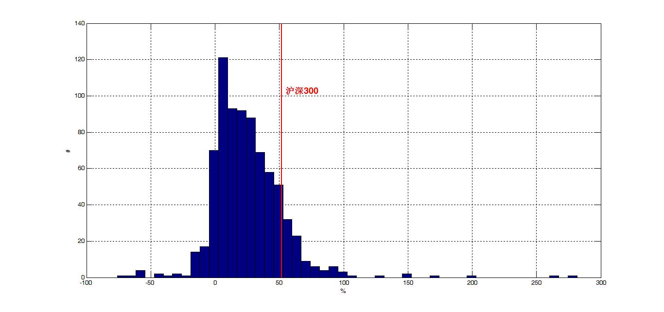 首先,我们将2014年有完整股价表现的共2223只股票与沪深300指数作对比。从图一可以看到,2014年表现优于沪深300的个股只有28%。换句话说,如果一个投资者随机选择一只股票进行投资,那么他战胜沪深300的概率只有28%。