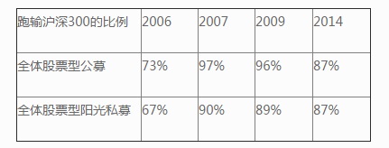 我们在表一中比较牛市中股票型公募、私募产品与沪深300指数的表现,可以看到, 2006年,73%的公募基金落后于沪深300指数,67%的阳光私募落后于沪深300指数;2007年,股票型公募基金有97%落后于沪深300,阳光私募也有90%左右跑输大盘。2009年,96%的股票型基金落后于沪深300,89%的私募基金落后于沪深300。