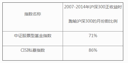 为了更清楚的说明这个现象,我们分月考察,在沪深300指数上涨的月份中,我们将中证股票型基金指数的收益率、CISI私募指数的收益率与沪深300的收益率进行对比。表二的结果表明,在沪深300上涨的月份中,股票型公募基金指数落后于沪深300指数的概率为71%,CISI私募指数落后于沪深300指数的概率高达86%。
