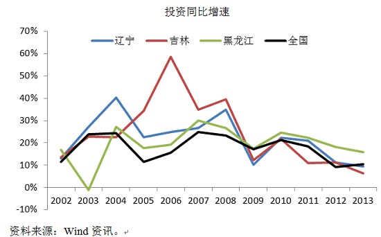 很明显,在2014年之前,东三省的GDP增速在绝大多数时候都高于全国的水平,而这种经济增长正是在投资高涨的情况下实现的(图表 4)。