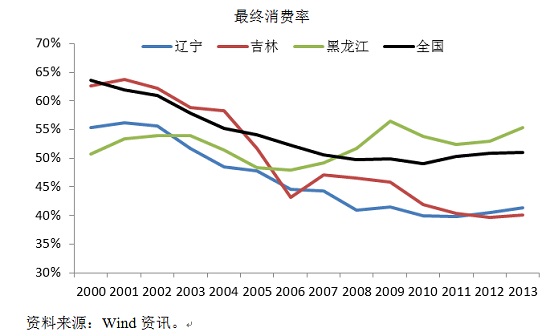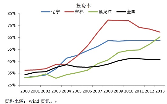 数据显示,辽宁、吉林和黑龙江的投资率在2000年的时候分别是32%、38%和31%,当时全国的投资率是34%,这基本处于同一水平。但在此之后,东三省的投资率扶摇直上,到2013年,辽宁、吉林和黑龙江的投资率已高达63%、70%和66%,而在2008年时,吉林的投资率甚至高达过80%。