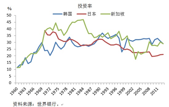 从1960年至2013年,韩日新(日本数据始于1970年)三国的投资率峰值为47%(1984年,新加坡),但这一数值很快下跌,并没有长期维持。假如将东三省的投资率与韩日新三国对比,其中的差距简直是“天壤之别”。