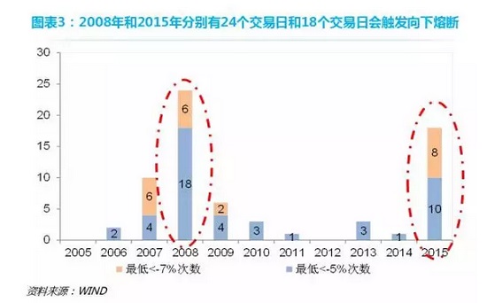 如果分年份考察,大多数可能触发熔断机制的交易日都发生在2007年和2014年两轮大牛市中,例如在2008年,共有19个交易日涨幅超过5%,其中7个交易日涨幅超过7%。