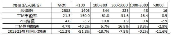 本文选取截至2015年11月13日全体A股的收盘数据进行计算,股票市值为该日收盘时的总市值。Wind资讯取得全部A股2780家,因为需要进行TTM增速的计算,剔除2015Q3无市值2家,剔除2014Q3无市值240家,剩余分析样本2538家。除非明示,文中数据下载于Wind数据库。
