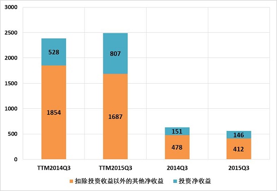 盈利下降使当下TTM市盈率高企,盈利增速出现下降固然有经济增速降低的原因,但出现如此大幅度的下降可能有其他因素在起作用。我们进一步对上市公司的净利润拆分为投资净收益与扣除投资净收益的其他净利润(营业利润等)两部分,如图表2所示,第三季度净利润从2014Q3的6.29千亿元下降至2015Q3的5.58千亿元,增长率为-11.3%,投资净收益同比增长从1.51千亿至1.41千亿,增长率为-2.9%,除去投资净收益的净利润同比增速为-13.9%;投资净收益和归功于公司主营业务利润水平的季度指标开始双双下降。