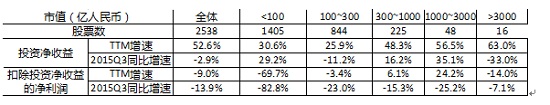 我们按分市值的方法计算了投资净收益、扣除投资净收益的净利润的增速,如图表3所示,小市值公司扣除投资净收益的净利润TTM增速仅为-69.7%,2015Q3同比增速-82.8%,下降严重。小市值股票不但呈现出“高市盈率”的特征,同时具备“高负增长”的特征,数据分析得出的结果将显著影响投资者信心与预期的恢复。小市值股票盈利能力的提升是稳定股市、活跃股市的关键。