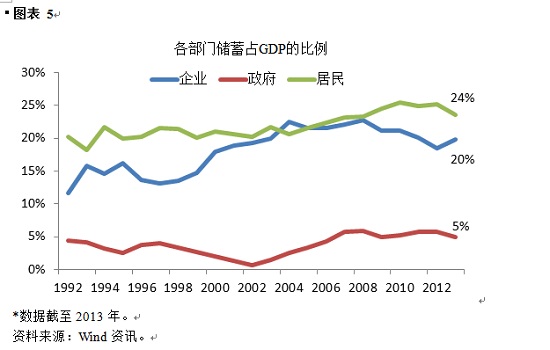 与低消费相对应的是高储蓄和高投资。中国不只是居民的储蓄率高,政府和企业的储蓄率也非常高。值得注意的是,居民的储蓄率虽然较高,但1992年以来占GDP的比例一直较为稳定地保持在20%左右的水平,而企业部门的储蓄率则呈现出快速上升的趋势,政府储蓄占GDP的比例自2002年以来也快速上升(图表 5)。