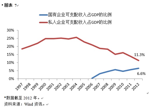 除此以外,就企业部门内部来看,国有企业储蓄率上升的速度是超过私人企业的。由于政府并未公布国有企业的可支配收入,因此这里笔者用国有企业的未分配利润来代表国有企业的可支配收入,然后用企业部门总的可支配收入减去国有企业的未分配利润来计算私人企业的可支配收入。