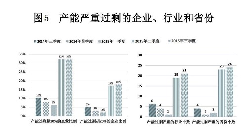 三季度调研发现,60%的企业开工率不足90%,较上季度的34%有大幅上升,而开工率不足70%的企业占比从二季度的9%骤升至20% (图4)。同时32%的企业表示产能过剩超过10%,18%的企业产能过剩超过20% (图5)。如果一个行业(地区)里有10%的企业认为其产能过剩超过20%,我们就将这个行业(地区)归类为产能过剩严重的行业(地区)。目前约三分之二的行业地区产能严重过剩。产能过剩严重行业数目从二季度的19个进一步上升到三季度的21个(行业总数:35);产能过剩严重地区从二季度的23个上升到三季度的24个(地区总数:31)。在最不景气的五个行业中,除纺织业和木材加工业之外,其余均为产能过剩严重的行业。